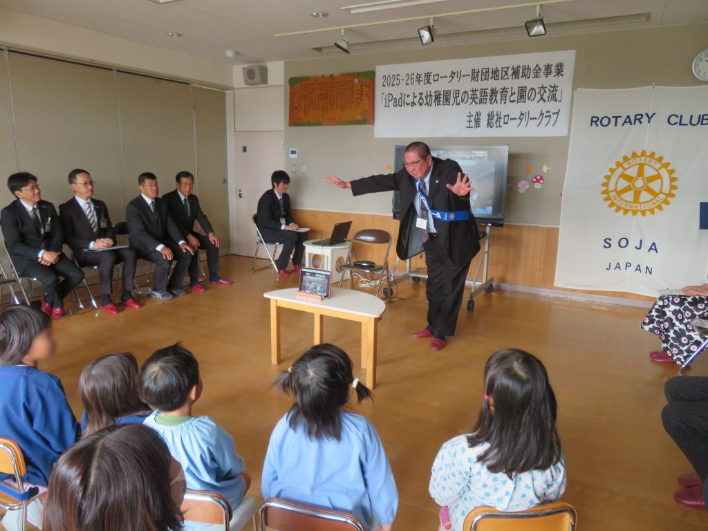 | 総社市西部地区にある5つの幼稚園は園児数が少なく、少人数教育や園同士の交流での移動等に課題があったためiPadを贈呈し、オンラインでのWEB交流幼稚園を開催した。 園が実施している英語特区を活かし、ALT(外国語指導助手)によるWEB英語学習、会員による保健・安全教育「元気に幼稚園!」の講話を行い、園児同士の交流と教育の充実を図った。 |